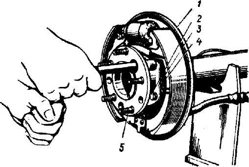 Рис. 107. Отворачивание болтов крепления щита тормозов и пластины крепления подшипника к балке заднего моста: 1 - щит тормоза; 2 - болты крепления; 3 - корпус наружного сальника; 4 - пластина крепления подшипника; 5 - фланец полуоси