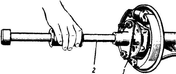 Рис. 108. Выпрессовка полуоси с помощью ударного съемника: 1 - полуось; 2 - ударный съемник |