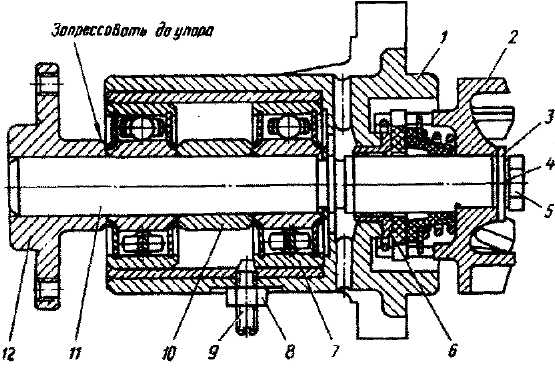 Рис. 48. Водяной насос: 1 - корпус насоса в сборе; 2 - крыльчатка в сборе; 3 - шайба; 4 - пружинная шайба; 5 - болт; 6 - втулка корпуса насоса; 7 - подшипник; 8 - гайка; 9 - стопорный винт; 10 - распорная втулка; 11 - валик в сборе; 12 - ступица Разборку водяного насоса производите в случае износа шарикоподшипников и выхода из строя сальникового уплотнения в следующем порядке: - отверните болт крепления крыльчатки; - спрессуйте с конца валика водяного насоса крыльчатку с помощью съемника; - расконтрите гайку зажимного винта шарикоподшипника и выверните винт; - уприте передний торец водяного насоса в шайбу с таким отверстием, через которое проходили бы шарикоподшипники, и ударом молотка через оправку по концу валика выбейте его из корпуса в сборе с шарикоподшипниками. Эту операцию, если есть возможность, выполняйте на ручном прессе; - спрессуйте шарикоподшипники с валика (только в случае большого зазора); - промойте все детали насоса, кроме манжеты и шайбы самоподжимного сальника, в бензине; - проверьте состояние поверхности торца втулки корпуса насоса. Поверхность должна быть гладкой, без забоин и повреждений (чистота поверхности должна быть 0,63). При необходимости прошлифуйте этот торец; - осмотрите детали уплотнения валика. Если насос разбирался по причине течи через уплотнение, то целесообразно заменить детали уплотнения на новые (401-1307038-02 - манжета; 412-1307041-10 - шайба); - осмотрите подшипники и их уплотнения. При обнаружении каких-либо дефектов подшипники замените. В собранном насосе валик должен вращаться от руки плавно без заеданий. Сборку производите в обратной последовательности. |