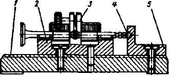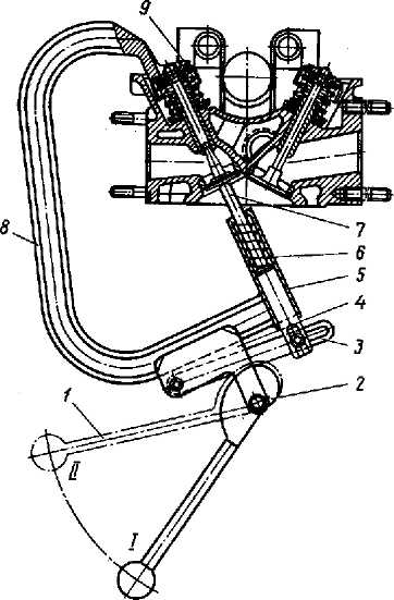 Рис. 33. Съемник клапанов: 1 - рычаг; 2 - кулачок; 3 - планка; 4 - кронштейн рычага; 5 - направляющий цилиндр; 6 - пружина; 7 - шток; 8 - скоба; 9 - упор; I, II - положения рычага 1 Затем установите съемник так, чтобы кольцевой упор 9 находился поверх тарелки пружин данного клапана, а шток упирался в торец головки клапана. При поворачивании рычага 1 из положения I в положение II кулачок 2 нажимает на планку 3 кронштейна 4 рычага, которая перемещает скобу 8 и тем самым сжимает обе пружины клапана. Когда пружины сжаты, снимите сухари со стержня клапана. Ослабляя нажим на рычаг съемника, освободите пружины клапана. Далее снимите съемник и пружины вместе с тарелкой клапана и защитным колпаком, а затем выньте клапан из направляющей втулки. Тем же способом снимите и все остальные клапаны. При износе стержней клапанов они заменяются на новые (стержни шлифовке не подлежат, т.к. направляющие втулки и сухари ремонтных размеров не изготавливаются). При установке в головку стержни клапанов обязательно смажьте графитовой смазкой. Установку клапанов производите в обратной последовательности. При этом проверьте состояние и величину износа стержней клапанов и их направляющих втулок, рабочих фасок, седел и клапанных пружин. При каждой сборке головки цилиндров с клапанами, после ремонта или после притирки клапанов, уплотнительные шайбы тарелки пружин клапана обязательно замените на новые, независимо от состояния. Эта замена необходима, чтобы исключить просачивание масла через уплотнительные шайбы, так как от времени материал шайбы твердеет и теряет упругость, необходимую для создания уплотнения. Проверка состояния клапанов и направляющих втулок Проверку состояния клапанов и направляющих втулок производите в следующем порядке: - клапаны, вынутые из направляющих втулок, тщательно очистите от нагара, лаговых отложений и промойте. Для временного хранения клапанов используйте деревянную подставку с отверстиями, куда вставляйте клапаны своими стержнями; - при замерах клапана определяется действительный диаметр стержня и биение рабочей фаски. Замеры диаметра стержня клапана производите микрометром, а биение рабочей фаски и стержня клапана на приспособлении (рис. 34). Если износ стержня клапана превышает допустимую величину, то замените клапан. Повышенное биение рабочей фаски клапана устраните шлифованием. Шлифование рабочей фаски производите, когда на поверхности ее имеются следы прогара, раковины и другие повреждения. Если износ направляющей втулки превышает допустимую величину, то замените ее.