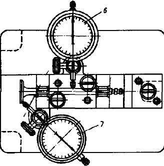 Рис. 34. Приспособление для проверки биения рабочей фаски и стержня клапана: 1 - плита; 2 - призма; 3 - держатель; 4 - шарик; 5 - стойка; 6 и 7 - индикаторы Шлифование рабочих фасок клапанов Для шлифования рабочих фасок клапанов применяйте специальный станок. При шлифовании снимайте минимальный слой металла, чтобы вывести черноту, раковины и биение, имеющиеся на рабочей фаске клапана. При обнаружении на фаске трещины или коробления самой головки клапан подлежит замене. При шлифовании следите, чтобы фаска не выходила на острие и всегда оставался цилиндрический поясок не менее 0,5 мм. Проверку биения рабочей фаски относительно поверхности стержня клапана производите на приспособлении (см. рис. 34). При проверке биения клапан укладывайте на призму 2, закрепленную на плите 1 так, чтобы торец его упирался в шарик 4, завальцованный в стойку 5. Затем два индикатора 6 и 7, закрепленные в держателях 3, подведите наконечниками к фаске клапана и его стержню. При проворачивании клапана, один индикатор покажет биение рабочей фаски, а другой биение стержня. Допустимое биение фаски и стержня не более 0,02 мм. Замена направляющих втулок клапанов Замену направляющей втулки клапана производите в следующем порядке: - выпрессуйте изношенную направляющую втулку клапана из головки цилиндров с помощью оправки (рис. 35); - установите головку цилиндров на сверлильный станок, имеющий наклонный стол. Наклоном стола (угол 26°+5' ) установите головку так, чтобы шпиндель станка был на оси отверстия направляющей втулки в головке. Затем в головке цилиндров, из которой выпрессована втулка, разверните отверстие до диаметра 15, 120-15, 142; - запрессуйте в развернутое отверстие в головке цилиндров ремонтную втулку (деталь 412-1007033-РП), имеющую увеличенный на 0,15 мм наружный диаметр (15,184-15,172 мм). Запрессовку производите с помощью оправки, с которой производилась выпрессовка. Перед запрессовкой направляющие втулки, изготовляемые из металлокерамики, предварительно пропитайте в масле для двигателя в течение не менее 1,5 часа. При запрессовке выдержать размер, указанный на рис. 36; - разверните отверстие в запрессованной втулке до диаметра 8,008-8,026 мм. При этом овальность и конусность не должны быть более 0,006 мм. После развертывания отверстия проверьте прямолинейность оправкой Ø 7,995 мм, которая должна свободно проходить на всю длину втулки.