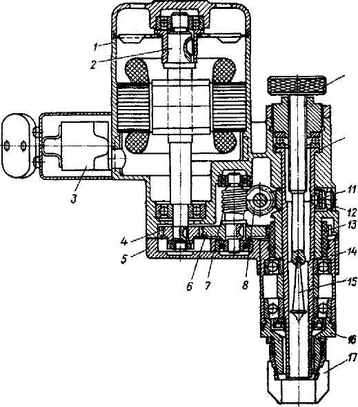 Рис. 37. Машинка для шлифования седла клапана: 1 - корпус; 2 - вал якоря; 3 - выключатель; 4 - ведущая шестерня; 5 - крышка корпуса; 6 - промежуточная шестерня; 7,8 - червяки; 9 - винт подачи; 10 - шпиндель; 11 - червячная шестерня; 12 - шпонка; 13 - шестерня; 14 - обойма; 15 - маятник; 16 - наконечник; 17 - абразивный круг Для шлифования применяйте специальную шлифовальную машинку с электрическим приводом (рис. 37). Машинка для шлифования должна быть снабжена набором абразивных кругов с конусами 90°, 120° и 60°; набором специальных оправок, вставляемых в отверстия направляющих втулок, и приспособлениями для правки абразивных кругов и для проверки биения фаски. Перед тем как приступить к шлифованию фаски, подберите оправку для отверстия в направляющей втулке, плотно входящую в нее. Подача абразивного инструмента производится вручную, а шлифование ведется до тех пор, пока абразивный круг не начнет снимать металл седла равномерно по всей окружности фаски. Проверку биения фаски по отношению к оси отверстия направляющей втулки производите на приспособлении, показанном на рис. 38.