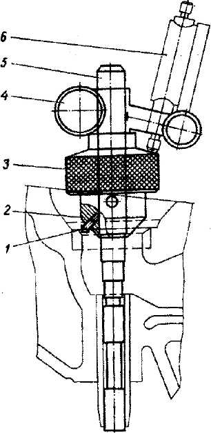 Рис. 38. Приспособление для проверки биения фаски на седле клапана: 1 - наконечник; 2 - отверстие для наконечника; 3 - муфта; 4 - держатель; 5 - оправка; 6 - индикатор Приспособление ставится на ту же оправку, на которой производилось шлифование фаски. Само приспособление состоит из муфты 3, вращающейся на оправке 5, держателя 4 индикатора 6, плотно закрепленного на оправке. Муфта 3 имеет на верхней части коническую поверхность, по которой скользит ножка стержня индикатора, а на нижней конической поверхности муфты в отверстие 2 вставлен специальный наконечник 1. При проворачивании рукой муфты 3 наконечник 1 перемещается по поверхности рабочей фаски седла и при наличии биения вызывает осевое перемещение муфты, которое передается на шкалу индикатора. Величина биений для фасок седел впускных и выпускных клапанов не должна превышать 0,05 мм. Для замера биения фасок седел впускных и выпускных клапанов требуется муфта с различным расположением наконечников, так как диаметры головок клапанов и фаски различны по размерам. Далее проверьте ширину и место расположения на фаске поверхности соприкосновения головки клапана с седлом. Эту проверку делайте следующим образом: - нанесите на седло клапана тонкий слой краски; - вставьте в направляющую втулку соответствующий клапан. Затем клапан проверните, прижимая его к седлу. Считают, что клапан хорошо сидит в седле, если образовавшийся на головке клапана поясок краски располагается в средней части фаски, а ширина пояска находится в пределах 1,2-1,5 мм как для впускного, так и выпускного клапана. Если указанное требование не выполнено, седло клапана прошлифуйте дополнительно (рис. 39). При этом абразивный круг в зависимости от того, куда требуется сместить рабочую фаску седла клапана, должен иметь конус 60° или 120°.