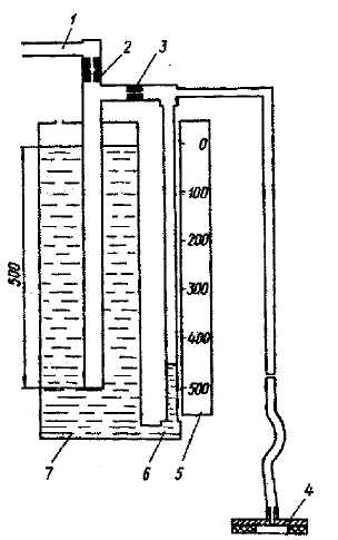 Рис. 40. Принципиальная схема пневматического приспособления для проверки герметичности клапанов: 1 - шланг подачи сжатого воздуха; 2, 3 - калибровочные насадки; 4 - воздушный колокол; 5 - шкала; 6 - манометрическая трубка; 7 - цилиндр После установки и сборки всего комплекта клапанов в головку цилиндров и использования пневматического приспособления проверьте их герметичность в следующем порядке: - установите воздушный колокол так, чтобы его резиновый уплотнитель 1 (рис. 41) накрыл одну из камер сгорания головки цилиндров; - подайте сжатый воздух (от компрессора, баллона или от воздушной сети) по шлангу 1 (см. рис. 40) в цилиндр 7 приспособления до получения давления в 500 мм водяного столба по шкале манометрической трубки 6; - наблюдайте за уровнем воды в трубке 6. Если он удерживается на одном уровне не менее 10 с, то посадка клапанов в седлах герметична.