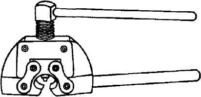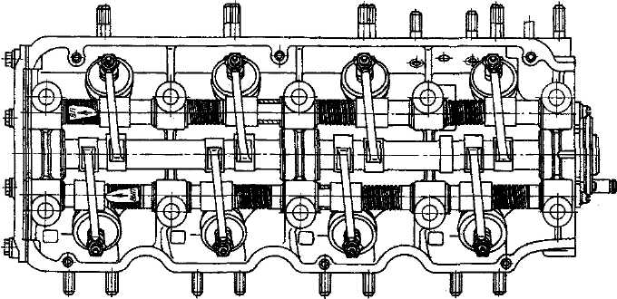 Рис. 45. Расположение на головке цилиндров деталей привода клапанов Проверка состояния коромысел клапанов и их осей Перед проверкой износа коромысел и осей все детали тщательно промойте в бензине и протрите чистой тряпкой. Коромысло проверьте по внутреннему диаметру отверстия и по величине ступеньки на цилиндрической поверхности опорной пятки. Ось коромысел проверьте по наружному диаметру. На цилиндрической поверхности опорной пятки коромысла допускается износ не более 0,05 мм (глубина канавки в средней части). Оси и коромысла, имеющие износы более допустимых, замените на новые. Проверка состояния и ремонт цепи привода газораспределения Цепь привода газораспределения обеспечивает нормальную работу двигателя на автомобиле на протяжении 125000 км. Проверку состояния цепи производите только при разборке механизма привода газораспределения. Проверку производите в следующем порядке: - промойте тщательно цепь в бензине, вытрите чистой тряпкой и просушите; - просмотрите все втулки цепи с целью выявления наличия трещин и сколов; - разъедините одно звено цепи с помощью съемника (рис. 46) и проверьте длину цепи, растянутой усилием 14 кгс. Длина на участке, равном 50 звеньям, не должна превышать 480 мм; - если длина цепи будет больше указанной, то ее замените. Перед установкой на двигатель цепь обязательно смажьте, окунув ее в масло для двигателя.