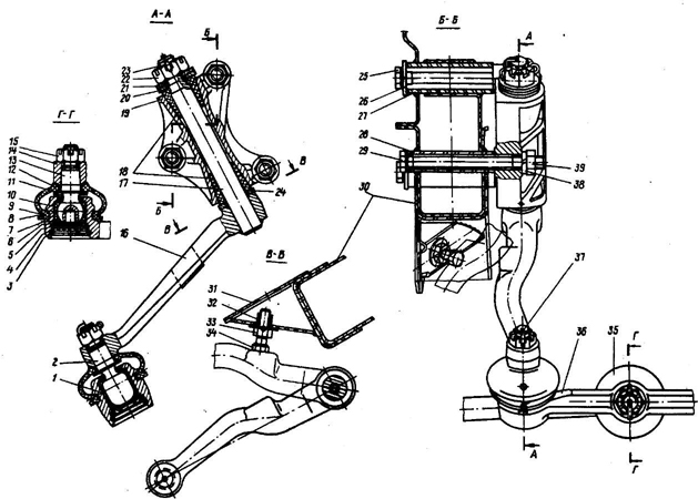 Рис. 173. Шарниры рулевых тяг: 1 - пластмассовая втулка; 2 - палец с овальной головкой; 3 - стопорное кольцо; 4 - заглушка; 5 - резиновое уплотнительное кольцо; 6 - пружина; 7 - вкладыш нажимной; 8 - вкладыш опорный нижний; 9 - шплинт-проволока; 10 - вкладыш опорный верхний; И - поддерживающая шайба; 12 - грязезащитный чехол; 13 - шаровой палец; 14 - бобышка сошки; 15 - гайка; 16 - маятниковый рычаг; 17 - ось; 18 - резиновые втулки; 19 - кронштейн маятникового рычага; 20, 24, 26 - шайбы простые; 21 - шайба с лыской; 22 - гайка; 23 - шплинт; 25 - болт длинный; 27 - втулка большая; 28 - втулка малая; 29 - болт короткий; 30 - лонжерон; 31 - ограничитель поворота; 32 - фланцевая гайка; 33 - гайка; 34 - болт ограничителя поворотов; 35 - наконечник боковой тяги; 36 - средняя тяга; 37 - шплинт; 38 - шайба пружинная; 39 - гайка Шарниры рулевых тяг самоподжимающиеся и регулировке в эксплуатации не подлежат. Все шесть шарниров рулевого привода надежно защищены от попадания грязи и не требуют пополнения смазки в эксплуатации. Смену ее производите только при разборке и сборке шарниров при ремонте. Разборка и сборка шарниров рулевого привода Для разборки и сборки шарниров рулевого привода используйте следующий инструмент и приспособления: съемник шарового пальца (9480-3194), тиски, приспособление для сборки шарниров (9680-2085). Разборку шарниров производите в следующем порядке: 1. Отверните на один-два оборота гайку шарового пальца и сдвиньте с места шаровой палец при помощи съемника (рис. 174). Если съемника нет, нанесите несколько резких ударов молотком по боковым поверхностям головок сошки или поворотного рычага. 2. Легкими ударами молотка по торцу пальца через медную или алюминиевую прокладку сдвиньте палец, а затем, отвернув гайку, вытащите его. 3. Развяжите проволоку 9 (рис. 173) с грязезащитного чехла 12 и снимите чехол и поддерживающую шайбу 11. 4. Сожмите усики стопорного кольца 3 и выньте кольцо из наконечника рулевой тяги. 5. Выньте из наконечника заглушку 4, резиновое кольцо 5, пружину 6, нажимной 7 и нижний 8 вкладыши, шаровой палец 13 и опорный вкладыш 10.