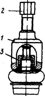 Рис. 174. Съемник шаровых пальцев рулевой трапеции: 1 - корпус; 2 - винт; 3 - сошка (или маятниковый рычаг, или средняя тяга) Сборку шарниров тяг рулевого привода производите в следующем порядке: 1. Вложите в наконечник рулевой тяги, предварительно смазав, опорный вкладыш, шаровой палец, нижний и нажимной вкладыши, пружину, резиновое кольцо и заглушку. 2. С помощью приспособления (рис. 175) или утопив заглушку отверткой и сжав усики стопорного кольца, установите стопорное кольцо в канавку наконечника. 3. Покачивая шаровой палец рукой из одного крайнего положения в другое, убедитесь в том, что для перемещения пальца требуется некоторое усилие. Если после замены изношенных деталей качание пальца все же будет очень легким, выньте заглушку и подложите под нее шайбу толщиной 0,5-2 мм и диаметром, равным диаметру заглушки. Осевое перемещение пальца не должно быть более 0,5 мм при усилии 80-100 Н (8-10 кгс). Наденьте на палец поддерживающую шайбу. 4. Наденьте на наконечник рулевой тяги полностью заполненный смазкой грязезащитный чехол, аккуратно вложите в паз чехла проволоку, заверните ее концы на два-три оборота и наверните на резьбовой конец хвостовика шарового пальца гайку.