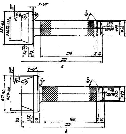 Рис. 119. Оправки для запрессовки наружных колец подшипников ведущей шестерни главной передачи: а - для кольца переднего подшипника; б - для кольца заднего подшипника. Материал - сталь 45. Термообработка: калить HRC 40-45, отпустить до HRC 28-32