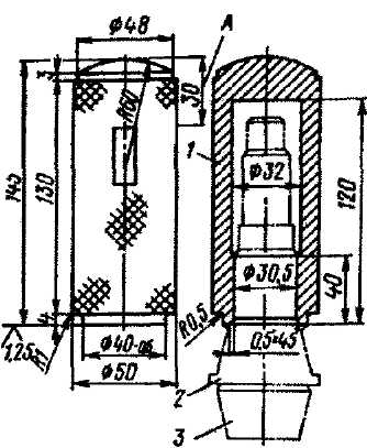 Рис. 120. Оправка для напрессовки внутреннего кольца заднего подшипника на вал ведущей шестерни главной передачи: 1 - оправка; 2 - кольцо подшипника; 3 - ведущая шестерня. Материал - сталь 45. Термообработка: калить HRC 40-45, на участке А отпустить до HRC 28-32