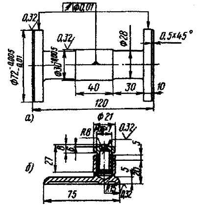 Рис. 122. Специальная оправка и микрометрическая стойка для замера монтажного размера в картере редуктора: а - оправка; б - микрометрическая стойка. Материал - сталь ХГ. Термообработка: калить, отпустить HRC 58-62. Допустимое биение - 0,01 мм