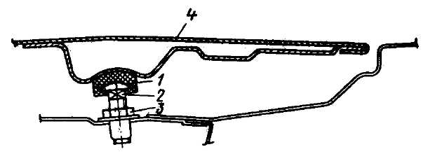 Рис. 265. Опорный буфер капота: 1 - буфер; 2 - болт; 3 - гайка; 4 - капот Необходимое усилие для закрывания капота на замок и прижатия к опорным резиновым буферам обеспечивается регулировкой положения защелки 2 (рис. 266) замка по высоте. При правильном положении защелки капот должен плотно прилегать к задним опорным буферам, а открывание капота должно быть легким. Опущенный (но не брошенный) капот должен закрываться на замок от резкого нажатия рукой. Если капот вибрирует при движении автомобиля, то проверьте, плотно ли затянута контргайка 3 защелки 2, и при необходимости затяните ее. Проверьте также, надежно ли затянуты болты 4 крепления замка 1 капота к кузову. Для того, чтобы защелка 2 при закрытом капоте надежно удерживалась щеколдой 6, необходимо, чтобы последняя полностью оттягивалась пружиной 5 до упора заклепки 7 в кромку овального отверстия. Для проверки выполнения этого требования отсоедините тягу привода замка капота и тягу аварийного привода от щеколды 6. Далее отверните болт 8, крепящий тягу в гайке 9 на щеколде, отогните загнутый конец тяги и, ослабив винт 10, сдвиньте скобу 11 влево. После этого щеколда 6 под действием пружины 5 займет нормальное положение. Убедитесь, свободно ли двигается проволочная тяга в оболочке, закрепите тягу в гайке щеколды болтом, свободный конец тяги отогните вниз и назад. Закрепите винтом 10 скобу 11 крепления аварийной тяги к оболочке троса привода замка. Если при оттягивании ручки привода замка капота (внутрь кузова) задняя кромка капота не приподнимается над поверхностью панели передка, то это в первую очередь указывает на поломку пружины 14 рычага 13 выталкивателя. Для установки новой пружины снимите замок капота, расширьте паз оси рычага 15 и удалите остатки пружины. Установите на ось новую пружину и раскерните ось в двух-трех местах.