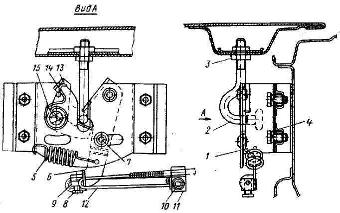 Рис. 266. Замок капота: 1 - замок капота; 2 - защелка; 3 - контргайка; 4 - болт; 5 - пружина; 6 - щеколда; 7 - заклепка; 8 - болт; 9 - гайка; 10 - винт; 11 - скоба; 12 - аварийная тяга; 13 - рычаг выталкивателя; 14 - пружина рычага; 15 - рычаги |
