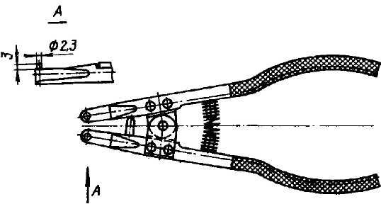 Рис. 55. Круглогубцы для снятия и установки стопорного кольца крепления рабочего цилиндра в картере сцепления 4. Отверните болты 29 (см. рис. 53) крепления грязезащитного щитка 31 к картеру сцепления и снимите щиток. 5. Отверните гайки крепления стартера к блоку цилиндров и снимите стартер со шпилек 25. 6. Отсоедините крепление подвески глушителя и выхлопной трубы и наклоните двигатель вниз, насколько позволяют передние опоры подвески двигателя. 7. Отверните гайки 3 крепления картера сцепления к блоку цилиндров двигателя при помощи торцевого ключа с коловоротом и шарниром, после чего подайте картер сцепления назад и снимите его с установочных трубчатых штифтов 14 и шпилек 4 и 15.