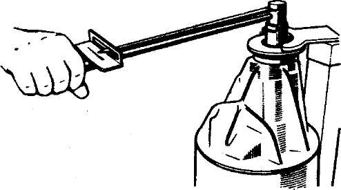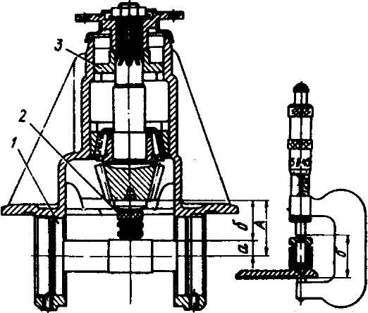 Рис. 128. Определение монтажного размера А в картере редуктора: 1 - контрольная оправка; 2 - микрометрическая стойка; 3 - опорная втулка 5. Вставьте в картер ведущую шестерню вместе с надетой на нее телескопической контрольной втулкой (рис. 123). Установите картер на сборочное приспособление, уперев торец ведущей шестерни в подставку. 6. С помощью оправки (рис. 120) легкими ударами молотка, чтобы не сбилась контрольная втулка, напрессуйте на ведущую шестерню внутреннее кольцо переднего подшипника, наденьте маслоотражательную шайбу и напрессуйте фланец крепления карданного вала. Наденьте шайбу и заверните гайку, прикладывая такой момент, чтобы после проворачивания ведущей шестерни на 8-10 оборотов момент сопротивления ее вращению (предварительный натяг) находился бы в пределах 1,5-3,5 Н·м (0,15-0,35 кгс·м). Выньте ведущую шестерню из картера. 7. Снимите контрольную телескопическую втулку. Замерьте микрометром или индикатором со стойкой разницу в высоте между телескопической и рабочей распорной втулкой подшипников. Эта разница и будет составлять размер пакета регулировочных прокладок, которые нужно установить вместе с распорной втулкой на ведущей шестерне между внутренними кольцами переднего и заднего подшипников. 8. Ведущую шестерню с установленными на ней распорной втулкой и пакетом регулировочных прокладок вставьте в картер и вновь установите на сборочном приспособлении. Напрессуйте внутреннее кольцо переднего подшипника, наденьте маслоотражательную шайбу. Напрессуйте фланец крепления карданного вала. Наденьте шайбу и заверните гайку динамометрическим ключом, момент затяжки 145-160 Н·м (14,5-16 кгс·м) (рис. 129).
