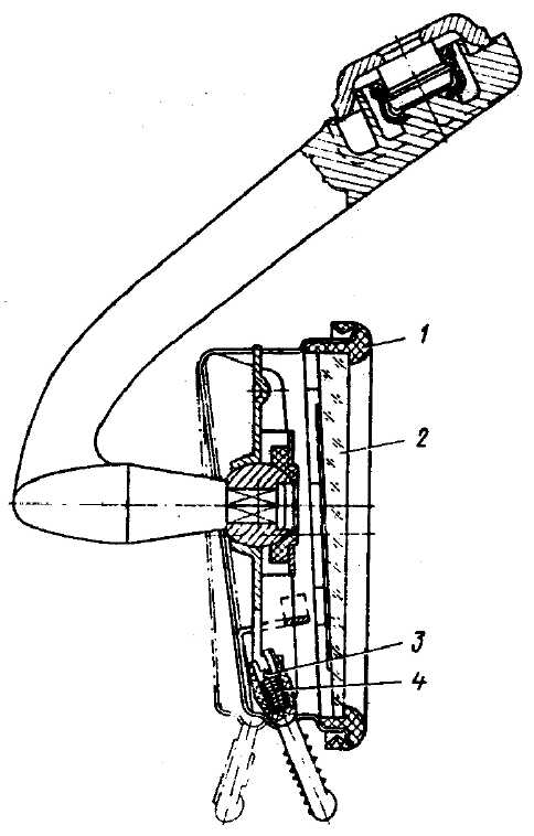 Рис. 274. Внутреннее зеркало заднего вида: 1 - рамка; 2 - зеркало; 3 - ось переключателя; 4 - пружина переключателя Замену пружины 4 (рис. 274) переключателя производите в следующем порядке: 1. Снимите зеркало, вывернув два винта его крепления. 2. Разберите зеркало, для чего отсоедините рамку 1 с зеркалом 2 от корпуса, нагрев рамку в струях теплого воздуха. Разбирайте зеркало осторожно, не повредив рамку 1, зеркало 2 и корпус. 3. Выньте ось переключателя 3, под которой находятся его пружины 4. 4. Замените пружины 4 переключателя. 5. Соберите зеркало, для чего сначала вставьте ось 3 в переключатель, затем наденьте рамку с зеркалом так, чтобы корпус своим краем вошел в паз пластмассовой рамки. ЗАМЕНА ПРУЖИНЫ ОСИ ПРОТИВОСОЛНЕЧНОГО КОЗЫРЬКА И СТОПОРА ЕЕ КРЕПЛЕНИЯ
