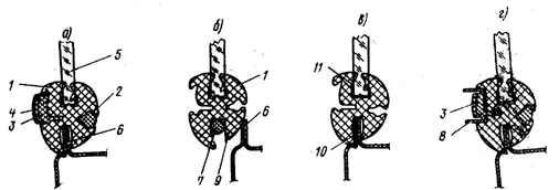 Рис. 269. Установка стекол ветрового и заднего окон: 1 - уплотнитель; 2 - замок уплотнителя; 3 - декоративный кант; 4 - декоративная скоба; 5 - стекло; 6 - фланец проема; 7 - монтажный шнур; 8 - инструмент для заправки декоративного канта; 9 - выступ уплотнителя; 10 - мастика; 11 - мастика или резиновый клей; а - стекло с уплотнителем, замком, декоративными кантом и скобой в проеме окна; б - установка стекла с уплотнителем в проеме; в - закладывание водозапорной мастики между уплотнителем и стеклом, уплотнителем и фланцем проема; г - заправка декоративного канта Оба стекла крепятся в проемах окон при помощи резиновых уплотнителей (рис. 269, а) замкового типа, состоящих из уплотнителя 1 и замка 2, представляющего собой резиновый шнур. Кроме того, в специальном пазе уплотнителя устанавливается декоративный кант 3, имеющий в середине нижней части проема стык, который закрывается декоративной скобой 4. Снятие стекла ветрового окна производите в следующем порядке: 1. Снимите внутри кузова боковые декоративные накладки, закрепленные на стойках ветрового окна при помощи шурупов. 2. Выньте замок из паза уплотнителя, для чего, найдя стык уплотнителя (в середине верхней части окна), при помощи отвертки выведите из паза концы замка, а затем вытяните весь замок [Перед началом этой операции снимите зеркало заднего вида]. 3.Выньте декоративный кант 3 из паза уплотнителя, для чего при помощи отвертки снимите декоративную скобу 4 и далее, найдя стык канта (в середине нижней части проема окна), при помощи отвертки выведите из паза концы канта, а затем вытяните весь кант. 4. Выньте стекло из проема, нажимая ладонями на его верхнюю часть изнутри кузова. Эту операцию производите вдвоем, чтобы помощник поддерживал стекло в момент выхода его из проема, предотвращая возможное его падение. Перед установкой стекла тщательно очистите проем от старой мастики и протрите бензином. Если уплотнитель не поврежден, то его можно использовать, также предварительно очистив и протерев. Установку стекла производите в следующем порядке: 1. Наденьте уплотнитель 1 на стекло 5. 2. Вложите в паз уплотнителя, предназначенного для охвата фланца оконного проема, монтажный шнур 7 (веревку диаметром не более 7 мм), выведя его концы из паза в середине нижней части стекла (рис. 270).