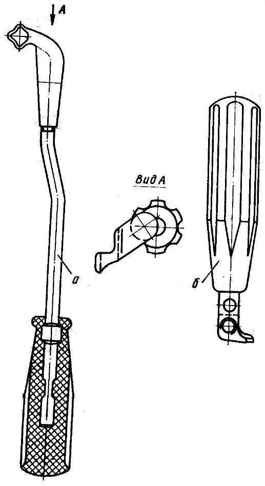 Рис. 271. Инструмент для установки замка уплотнителей стекол кузова и декоративного канта: а - оправка для установки замка уплотнителей стекол кузова; б - оправка для установки декоративного канта в уплотнитель стекла 8. Заправьте замок 2 в паз уплотнителя 1 изнутри кузова. Выполняйте это при помощи оправки "б" 9487-1924 (рис. 271), начиная с середины верхней части уплотнителя, заводя инструмент в паз с продетым в него концом замка. Перемещая инструмент вдоль паза, заправьте замок по всему периметру уплотнителя. Перед заправкой смажьте замок глицерином. Если нет специального инструмента, то заправку производите при помощи притупленной отвертки, осторожно раздвигая ею паз и вводя в него замок. Замену стекла заднего окна производите аналогичным образом, но при этом имейте в виду, что заднее стекло имеет токообогрев, подключенный к общей электросистеме автомобиля. Поэтому, перед началом работы снимите клемму с аккумуляторной батареи и отсоедините провода токоподвода и провод "массы" от клемм, находящихся на боковых сторонах стекла. Кроме этого, снимите обивку задних стоек, которая крепится при помощи пружинных пистонов. |