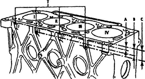 Блок цилиндровБлок цилиндров изготовлен из чугуна с выточенными в нем цилиндрами, без каналов для воды между ними. Имеется три класса для внутреннего диаметра цилиндра. Они помечены на блоке цилиндров сверлением диаметром 5 мм на стороне, противоположной коллекторам (рис. 2-120). Расстояние от верха блока цилиндров до центра отверстий определяет класс: Класс А (18 мм ) Класс В (24 мм ) Класс С (30 мм ) Для полной очистки блока необходимо извлечь предохранительные заглушки, предварительно просверлив в них отверстие для самонарезного винта. Удалить все следы старых прокладок. Промыть все каналы моющими растворами, а затем продуть сжатым воздухом. Проверить блок на наличие трещин, сколов и коррозии. Измерить нутромером фактический размер цилиндров ниже пояска износа (см. рис. 2-21). Проверить не превышает ли зазор между цилиндром и поршнем заданной величины. Первоначальный зазор между цилиндром и поршнем составляет 0,035-0,065 мм. Ввиду отсутствия поршней ремонтного размера при сильном износе отверстий цилиндров рекомендуется заменить блок цилиндров.