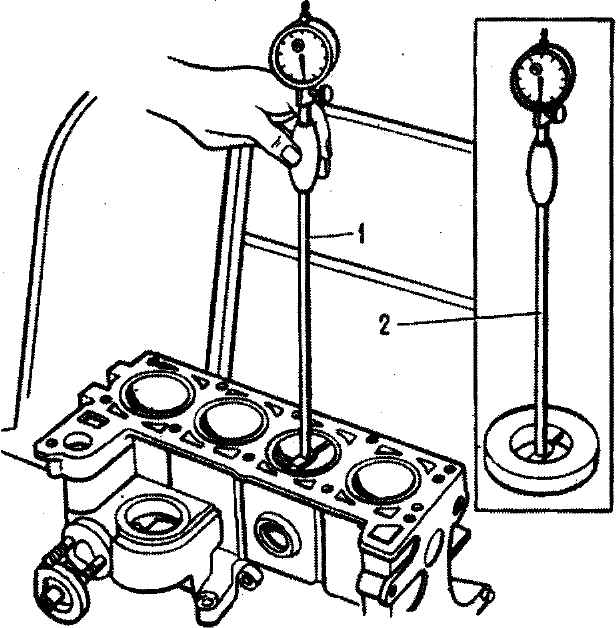 Рис. 2-21. Измерение цилиндров двигателя ВАЗ нутромером: 1 - нутромер; 2 - установка нутромера на ноль по калибру А.96137
