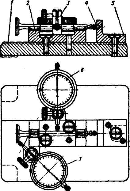 Рис. 2-99. Приспособление для проверки биения рабочей фаски и стержня клапана: 1 - плита; 2 - призма; 3 - держатель; 4 - шарик; 5 - стойка; 6 и 7 - индикаторы При проверке биения клапан укладывается на призму 2, закрепленную на плите 1 так, чтобы торец его упирался в шарик 4, завальцованный в стойку 5. Затем два индикатора 6 и 7, закрепленные в держателях 3, подводятся наконечниками к фаске клапана и его стержню. При проворачивании клапана один индикатор покажет биение рабочей фаски, а другой - биение стержня. Допустимое биение фаски и стержня не более 0,02 мм. Направляющие втулки клапанов Если износ направляющих втулок превышает допустимую величину, указанную в табл. 2-7, то следует произвести замену втулок. Замену направляющей втулки клапана следует производить в следующем порядке: - выпрессовать изношенную направляющую втулку клапана из головки цилиндров с помощью оправки (рис. 2-100);