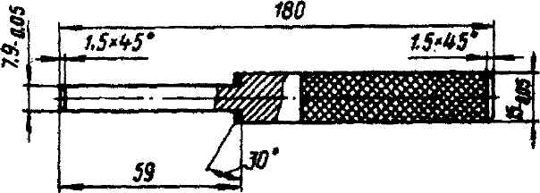 Рис. 2-100. Оправка для выпрессовки и запрессовки направляющей втулки клапана двигателя - установить головку цилиндров на сверлильный станок, имеющий наклонный стол. Наклоном стола (угол 26°+5') установить головку так, чтобы шпиндель станка был на оси отверстия направляющей втулки в головке. Затем в головке цилиндров, из которой выпрессована втулка, развернуть отверстие до диаметра 15,12-15,142 мм; - запрессовать в развернутое отверстие в головке цилиндров ремонтную втулку, имеющую увеличенный на 0,15 мм наружный диаметр (15,172-15,184 мм). Запрессовку следует производить оправкой, с помощью которой производилась выпрессовка. Перед запрессовкой направляющие втулки, изготовленные из металлокерамики, предварительно пропитать в моторном масле в течение не менее 1,5 ч. При запрессовке выдержать размер, указанный на рис. 2-101;