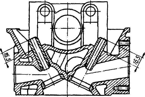 Рис. 2-101. Положение направляющих втулок клапана после их запрессовки в головку цилиндров двигателей УЗАМ - развернуть отверстие в запрессованной втулке до диаметра 8,008-8,026 мм. При этом овальность и конусность не должны быть более 0,006 мм. После развертывания отверстия проверить прямолинейность втулки оправкой диаметром 7,995 мм, которая должна свободно проходить на всю длину втулки. Коромысла клапанов и их оси Тщательно промыть коромысла и их оси в бензине и протереть чистой тряпкой. Коромысло проверить по внутреннему диаметру отверстия и по величине ступеньки на цилиндрической поверхности опорной пяты. Ось коромысла проверить по наружному диаметру. Допустимые величины износа диаметра отверстия в коромысле и наружного диаметра оси приведены в табл. 2-7. На цилиндрической поверхности опорной пяты коромысла допускается износ не более 0,05 мм (глубина канавки в средней части). Оси коромысел, имеющие износы более допустимых, заменить новыми. Пружины Убедиться, нет ли на пружинах трещин и не снизилась ли их упругость, для чего проверить деформацию пружин под нагрузкой. Для новых пружин усилие должно быть: - 398-464 Н (40,7-47,3 кгс) - для большой пружины при длине 27,5 мм и 160-185 Н (16,3-18,9 кгс) при длине 36,5 мм; - 242-280 Н (24,6-28,6 кгс) для малой пружины при длине 25,5 мм и 100-116 Н (10,2-11,8 кгс) при длине 34,5 мм. Если при проверке окажется, что усилие пружины на 10% меньше усилия новых пружин, то пружину необходимо заменить. Следует иметь в виду, что усилие, создаваемое пружиной, уменьшается, если фаска клапана и фаска седла были подвергнуты шлифованию, так как при этом увеличивается рабочая высота пружины и, следовательно, уменьшается усилие прижатия клапана к седлу. Поэтому при сборке деталей клапанного механизма под опорные тарелки пружин надо подкладывать дополнительные шайбы. Толщину шайб выбирать так, чтобы при закрытом клапане длина большой пружины была 36,5 мм. Уплотнительные шайбы.
