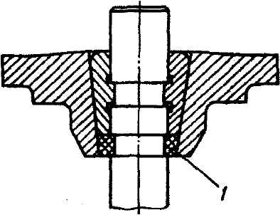 Рис. 2-102. Конструкция уплотнения зазора между сухарями клапана двигателей УЗАМ: 1 - уплотнительная шайба После каждой разборки клапанного механизма производить замену старых уплотнительных шайб 1 (рис. 2-102) новыми. Окончательную проверку уплотнительных шайб производить после сборки головки цилиндров. Для этого установить головку так, чтобы оси каждого ряда клапанов были поочередно вертикальны, и в зазоры между сухарями налить бензин. Если бензин остается длительное время в зазорах между сухарями, то уплотнительные шайбы обеспечивают уплотнение. У клапанов, где просачивается бензин, заменить уплотнительные шайбы. Проверка герметичности и притирка клапанов Проверку герметичности клапанов можно осуществлять следующими способами: - по разрыву слоя краски, наносимой на фаски седел и головок клапанов; - по просачиванию керосина, заливаемого в камеру сгорания; - с помощью приспособления и по методике, аналогично указанной для проверки герметичности клапанов двигателя ВАЗ (см. рис. 2-43). В случае негерметичности клапанов следует произвести их притирку в следующем порядке: - надеть на стержень 3 (рис. 2-103) притираемого клапана отжимную пружину; - нанести на фаску головки клапана тонкий слой притирочной пасты, приготовляемой в виде смеси мелкого наждачного порошка с моторным маслом; - вставить клапан с отжимной пружиной в направляющую втулку воротка и зафиксировать его прижимным винтом 1; - проворачивать клапан с помощью приспособления в обе стороны, периодически слегка прижимая его к седлу. При притирке не снимать с рабочих фасок клапанов и седел слишком много металла, так как это сокращает количество ремонтов седла и клапана и тем самым уменьшает общую продолжительность их службы. К концу притирки уменьшить содержание наждачного порошка в притирочной пасте, а с момента, когда притертые поверхности станут совершенно гладкими и примут ровный сероватый цвет, притирку вести только на одном чистом масле. Внешним признаком удовлетворительной притирки является однотонный матово-серый цвет (без черных пятен) на рабочих поверхностях головки клапана и его седла.