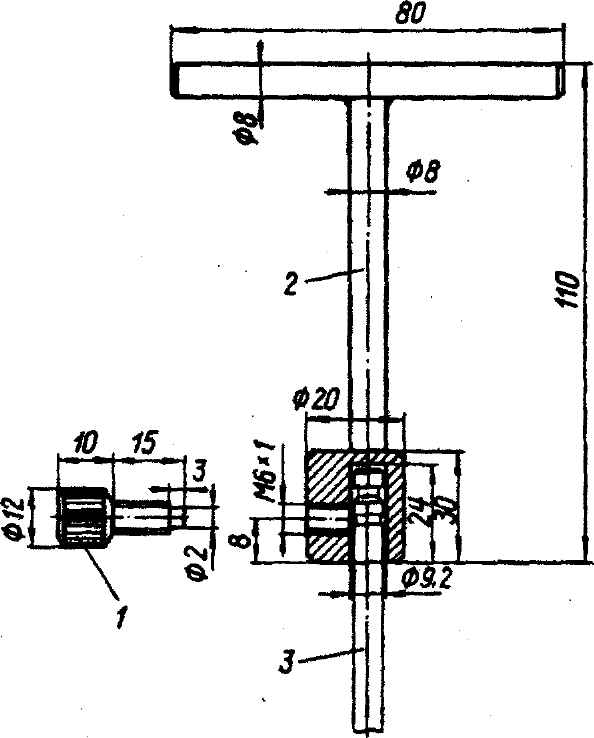 Рис. 2-103. Приспособление для притирки фасок клапанов двигателя УЗАМ: 1 - прижимной винт; 2 - вороток; 3 - стержень клапана