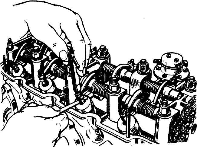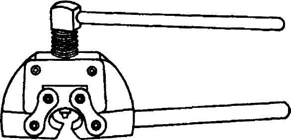 Рис. 2-105. Проверка теплового зазора у клапанов двигателей УЗАМ Регулировка натяжения цепи Отвернуть стопорный болт натяжного устройства на 0,5-0,75 оборота (см. рис. 2-89). Провернуть коленчатый вал по часовой стрелке на 2-3 оборота с отпущенным стопорным болтом натяжного устройства для выбора всех зазоров в приводе распределительного вала, после чего завернуть стопорный болт до упора. Проверка распределительного вала Тщательно промытый и насухо протертый распределительный вал осмотреть, замерить диаметры шеек и проверить состояние поверхностей кулачков, шеек и эксцентрика. При наличии задиров на кулачках вал для дальнейшей эксплуатации непригоден. Шлифование шеек вала и кулачков под ремонтные размеры при износе не допускается. Пределы допустимых износов указаны в табл. 2-7. Если зазоры превышают допустимые значения, вал следует заменить. Цепь привода распределительного вала Проверку состояния цепи производить только при разборке механизма привода распределительного вала в следующем порядке: - промыть тщательно цепь в бензине, вытереть ее чистой тряпкой и просушить; - просмотреть все втулки цепи с целью выявления наличия трещин и сколов; - разъединить одно звено цепи с помощью съемника (рис. 2-106) и проверить длину цепи, растянутой усилием 140 Н (14 кгс). Длина на участке, равном 50 звеньям, не должна превышать 480 мм. Если длина цепи будет больше указанной, то ее необходимо заменить. Перед установкой на двигатель цепь обязательно смазать, окунув ее в моторное масло.
