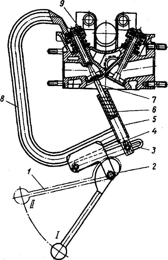 Рис. 2-94. Съемник клапанов 9680-2449: 1 - рычаг; 2 - кулачок; 3 - планка; 4 - кронштейн рычага; 5 - направляющий цилиндр; 6 - пружина; 7 - шток; 8 - скоба; 9 - упор; I, II - положения рычага Сборку головки цилиндров производить в обратном порядке. При этом проверить состояние и величину износа стержней клапанов и их направляющих втулок, рабочих фасок, седел и клапанных пружин. При каждой сборке головки цилиндров с клапанами после ремонта или после притирки клапанов уплотнительные шайбы тарелки пружин клапана обязательно заменять новыми, независимо от состояния. При износе стержней клапанов заменить клапаны новыми. При установке в головку стержни клапанов обязательно смазать графитной смазкой. Перед установкой осей коромысел проверить степень износа рабочих поверхностей коромысел и их осей и при необходимости заменить изношенные детали; установку коромысел и распорных втулок производить согласно меткам, сделанным при разборке, а осей коромысел в соответствии с выбитыми метками "ВП" и "ВЫП" (рис. 2-95). Перед установкой коромысел на оси поверхности отверстий в коромыслах смазать графитной смазкой.