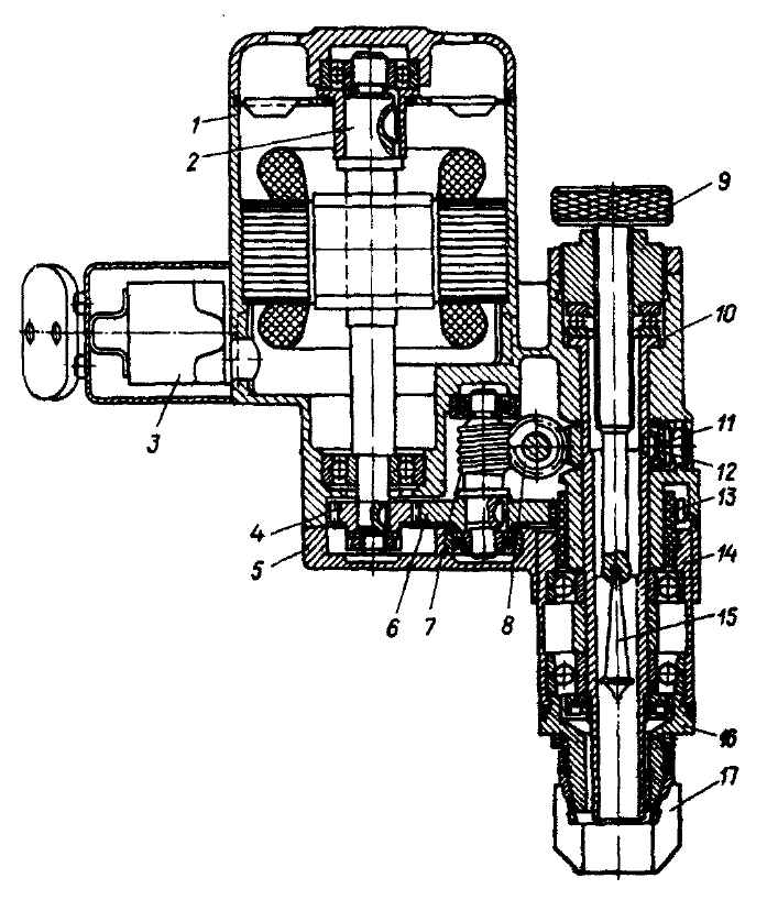Рис. 2-96. Машинка для шлифования фаски в седле клапана: 1 - корпус; 2 - вал якоря; 3 - выключатель; 4 - ведущая шестерня; 5 - крышка корпуса; 6 - промежуточная шестерня; 7, 8 - червяки; 9 - винт подачи; 10 - шпиндель; 11 - червячная шестерня; 12 - шпонка; 13 - шестерня; 14 - обойма; 15 - маятник; 16 - наконечник; 17 - абразивный круг