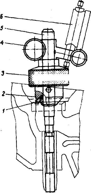 Рис. 2-97. Приспособление для проверки биения фаски на седле клапана: 1 - наконечник; 2 - отверстие для наконечника; 3 - муфта; 4 - держатель; 5 - оправка; 6 - индикатор Проверка и шлифование седел клапанов Шлифование рабочих фасок седел клапанов производить обязательно при замене направляющих втулок клапанов, а также при большом износе и биении фасок седел относительно оси отверстий направляющих втулок. Для шлифования применять специальную шлифовальную машинку с электрическим приводом (рис. 2-96). Машинка для шлифования должна быть снабжена набором абразивных кругов с конусами 60, 90 и 120°, набором специальных оправок, вставляемых в отверстия направляющих втулок, и приспособлениями для правки абразивных кругов и для проверки биения фаски. Перед тем как приступить к шлифованию фаски, необходимо подобрать оправку для отверстия в направляющей втулке, плотно входящую в неё. Подача абразивного инструмента производится вручную, а шлифование ведется до тех пор, пока абразивный круг не начнет снимать металл седла равномерно по всей окружности фаски. Проверку биения фаски по отношению оси отверстия направляющей втулки производить на приспособлении, показанном на рис. 2-97. Приспособление ставится на ту же оправку, на которой производилось шлифование фаски. Само приспособление состоит из муфты 3, вращающейся на оправке 5, держателя 4 индикатора 6, плотно закрепленного на оправке. Муфта 3 имеет на верхней части коническую поверхность, по которой скользит ножка стержня индикатора, а на нижней конической поверхности муфты в отверстие 2 вставлен специальный наконечник 1. При проворачивании рукой муфты 3 наконечник 1 перемещается по поверхности рабочей фаски седла и при наличии биения вызывает осевое перемещение муфты, которое передается на шкалу индикатора. Величина биения для фасок седел впускных в выпускных клапанов не должна превышать 0,05 мм. Для замера биения фасок седел впускных и выпускных клапанов требуется муфта с различным расположением наконечников, так как диаметры головок клапанов и фаски различны по размерам. Размеры фасок седел клапанов показаны на рис. 2-98.