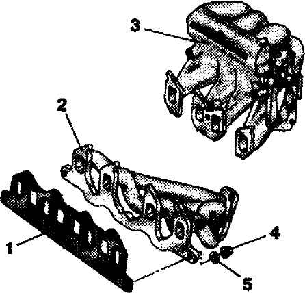 Рис. 2-122. Впускной и выпускной трубопроводы двигателя F3R: 1 - уплотнительная прокладка; 2 - выпускной трубопровод; 3 - впускной трубопровод; 4 - гайка; 5 - шайба - снять ремень привода вспомогательных агрегатов, для чего, ослабив гайку 2 (см. рис. 2-123) крепления генератора к кронштейну и гайку болта 6 натяжителя полностью отвернуть контргайку 4 и гайку 5 и максимально придвинув генератор к блоку, снять ремень;