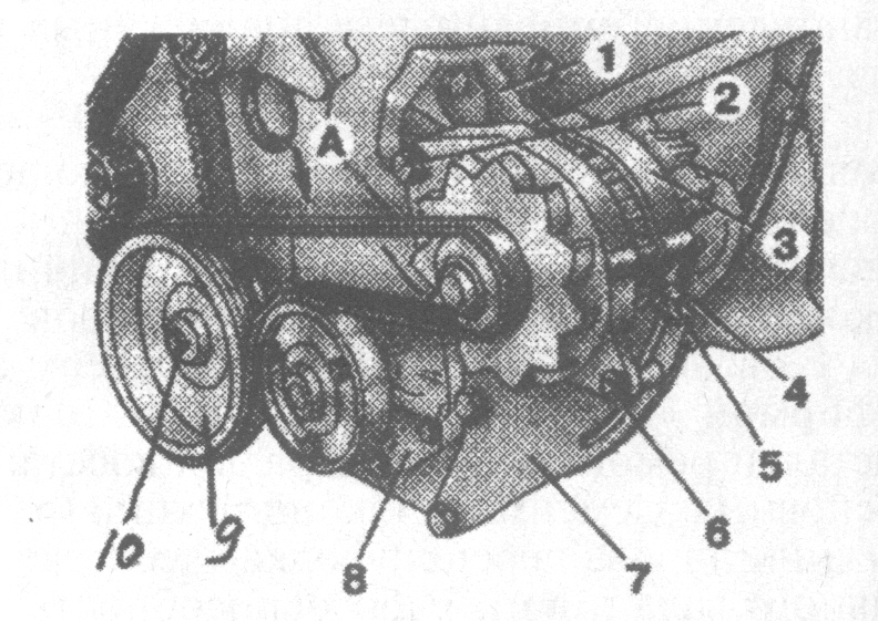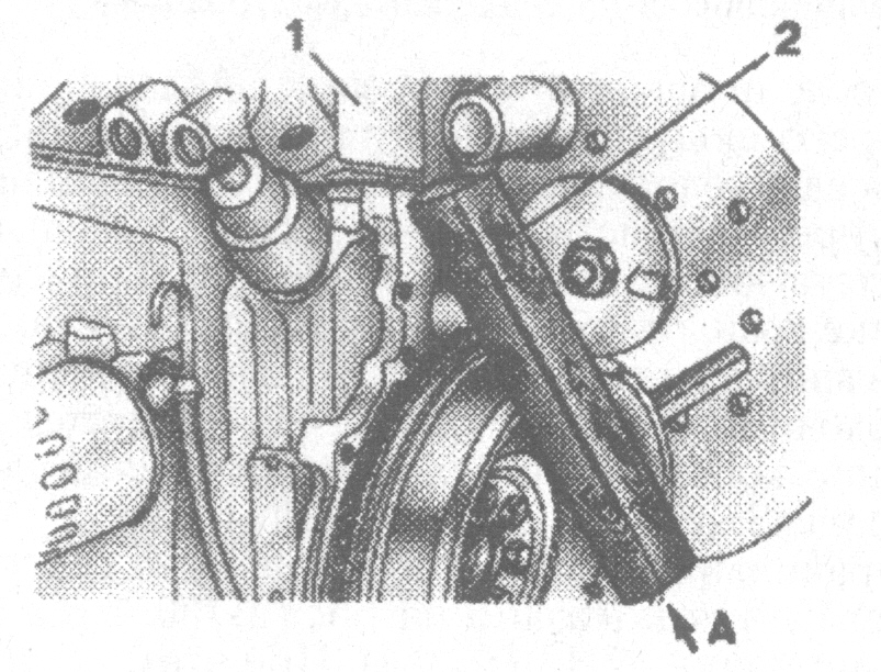 Рис. 2-123. Привод вспомогательных агрегатов двигателя Рено F3R: 1 - кронштейн крепления генератора; 2 - болт крепления генератора к кронштейну; 3 - генератор; 4 - контргайка; 5 - гайка натяжителя; 6 - болт натяжителя; 7 - кронштейн; 8 - водяной насос; 9 - шкив; 10 - болт крепления шкива; А - место контроля натяжения ремня - снять ремень привода газораспределительного механизма (см. раздел "Замена ремня газораспределения"); - снять топливную рейку с двигателя (см. раздел "Система питания"); - отвернуть 10 болтов крепления головки блока и постукиванием молотка через деревянный брусок 2 (рис. 2-124) в направлении А приподнять и затем снять головку.