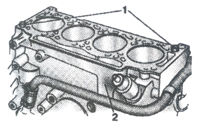 Рис. 2-125. Расположение установочных втулок головки блока двигателя F3R: 1 - установочные втулки; 2 - блок цилиндров двигателя |