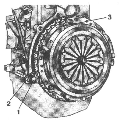 Рис. 2-148. Фиксация от проворачивания коленчатого вала двигателя F3R: 1 - болт крепления приспособления; 2 - приспособление для фиксации коленчатого вала; 3 - маховик