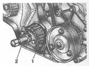 Рис. 2-149. Снятие зубчатого шкива с коленчатого вала двигателя F3R: 1 - шкив; 2 - съемник