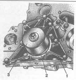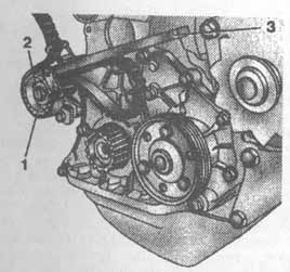 Рис. 2-150. Запрессовка переднего сальника коленчатого вала двигателя F3R: 1 - передняя крышка двигателя; 2 - сальник; 3 - приспособление для запрессовки сальника При отсутствии оправки или приспособления передний сальник коленчатого вала можно заменить, сняв с двигателя переднюю крышку 1 (рис. 2-151). Для этого нужно предварительно снять промежуточный зубчатый ролик ремня привода ГРМ 1 (рис. 2-152), отвернув болт 2 его крепления и удерживая от проворачивания приспособлением 3.
