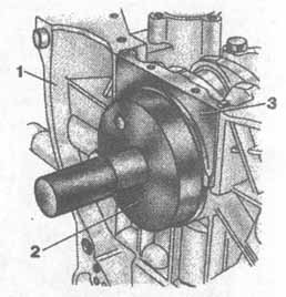 Рис. 2-152. Снятие промежуточного зубчатого ролика ремня привода ГРМ двигателя F3R: 1 - промежуточный ролик; 2 - болт крепления ролика; 3 - приспособление для фиксации ролика Отвернув 10 болтов крепления (показаны стрелками на рис. 2-151), снять крышку. Перед установкой крышки с новым сальником на двигатель ее привалочную поверхность нужно покрыть слоем силиконового герметика, предварительно очистив ее от остатков старого уплотнения. Затягивать болты крепления крышки следует постепенно крест-накрест моментом 14 Н·м (1,4 кгс·м), причем первыми нужно затянуть болты А (см. рис. 2-151). Для замены заднего сальника на автомобиле необходимо снять с автомобиля коробку передач, зафиксировать от проворачивания коленчатый вал двигателя приспособлением 2 (см. рис. 2-148), отвернуть болты крепления и снять с маховика сцепление, отвернуть шесть болтов крепления маховика и снять маховик. Затем нужно вынуть заостренным инструментом сальник из гнезда, образованного блоком 1 (рис. 2-153) и крышкой 3 коренного подшипника коленчатого вала 1-го цилиндра. Смазав новый сальник моторным маслом, запрессовать его в гнездо с помощью оправки 2.
