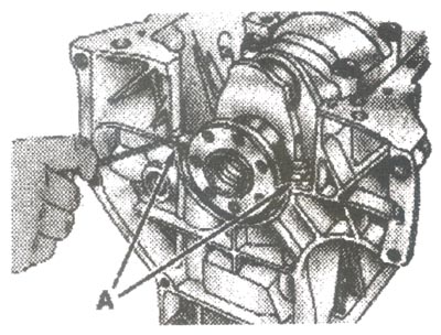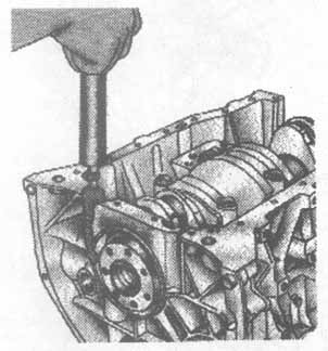 Рис. 2-155. Герметизация крышки 1-го коренного подшипника коленчатого вала двигателя F3R Затем установить на место крышку коренного подшипника и затянуть болты ее крепления моментом 65 Н·м (6,5 кгс·м). Ввести (специальным шприцом) в зазоры между крышкой и блоком .цилиндров герметик (рис. 2-155) и удалить его излишки. Сразу же вслед за этим для предотвращения вытекания герметика установить на место масляный картер двигателя с новой прокладкой. Маховик Проверить состояние зубчатых венцов и в случае повреждения зубьев заменить маховик. Маховик имеет два зубчатых венца. Первый венец служит для запуска двигателя. Второй венец имеет 60 равномерно расположенных зубьев, 2 из которых удалены для того, чтобы датчик смог определить начальную точку отсчета для информации электронного блока управления о моменте нахождения поршней 1-го и 4-го цилиндров в ВМТ. Поверхности маховика, сопрягаемые с коленчатым валом и с ведомым диском сцепления, должны не иметь царапин, задиров и быть совершенно плоскими. Если на рабочей поверхности маховика под ведомый диск сцепления имеются царапины, следует проточить эту поверхность, снимая слой металла толщиной не более 0,5 мм. Предупреждение. Фирма Рено требует каждый раз заменять новыми болты крепления маховика. Так как в конструкции двигателя не предусмотрены элементы их стопорения, перед заворачиванием резьбовую часть болтов необходимо смазать фиксирующим составом "Loctite" или ему подобным. Затягивать болты следует крест-накрест 50-55 Н·м (5.0-5.5 кгс·м). Примечание. Для сохранения балансировки двигателя маховик устанавливают на фланец коленчатого вала строго в одном положении. Для обеспечения этого условия отверстия под болты крепления в маховике и фланце коленчатого вала расположены по окружности неравномерно. Кроме того, для облегчения поиска нужного положения в одном из отверстий маховика и фланца выполнены фаски увеличенного размера. При сборке эти отверстия надо совместить. |