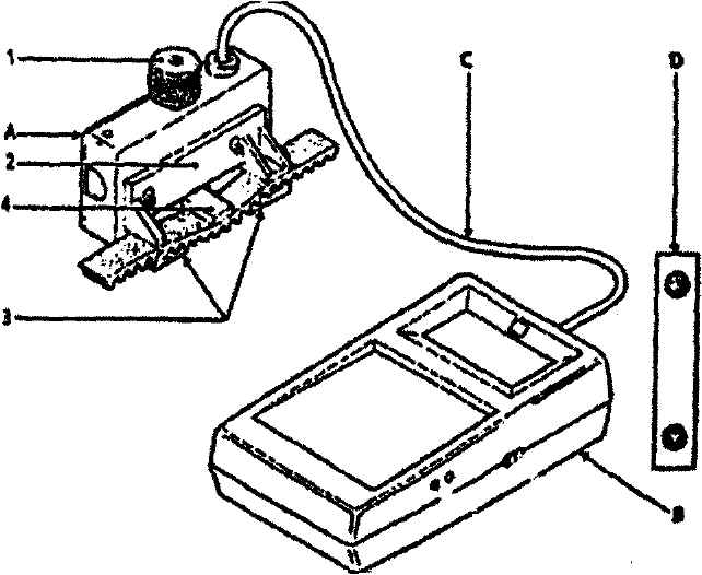 Рис. 2-144. Прибор МОТ. 1237 SEEM для измерения натяжения ремней привода ГРМ и вспомогательных агрегатов двигателя Рено F3R: 1 - рукоятка датчика; 2 - направляющий кронштейн; 3 - нижние упоры; 4 - измеряющий элемент датчика; А - датчик; В - прибор; С - соединительный кабель; D - тарировочная пластина Перед использованием прибора необходимо произвести его проверку с помощью эталонной пластины, на которую нанесены два цифровых значения. Для этого следует включить прибор, при необходимости выставить его показания на "0", и установить эталонную пластину в датчик. Произвести затяжку рукояткой на датчике до 3-х щелчков и сравнить показания на приборе с цифровыми значениями на эталонной пластине. Если цифровое значение на приборе находится в пределах цифровых значений на пластине, прибор можно использовать. Например: значения на эталонной пластине 44-51, прибор показывает 46 единиц SEEM. Если прибор будет показывать значение ниже 44 ед. SEEM или выше 51 ед. SEEM, использовать такой прибор нельзя. Предупреждение. Каждому прибору МОТ. 1273 SEEM соответствует только одна эталонная пластина. При ее утере или поломке, пластины от других аналогичных приборов использовать нельзя. Величины контрольных значений натяжения ремней для двигателей F3R различных модификаций приведены в табл. 2-11. Таблица 2-11. Контрольные параметры натяжения ремней