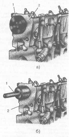 Рис. 2-147. Установка оправки для запрессовки заднего сальника распределительного вала двигателя Рено F3R, установленного на автомобиле (а) и на снятой головке блока (б): 1 - оправка; 2 - головка блока |