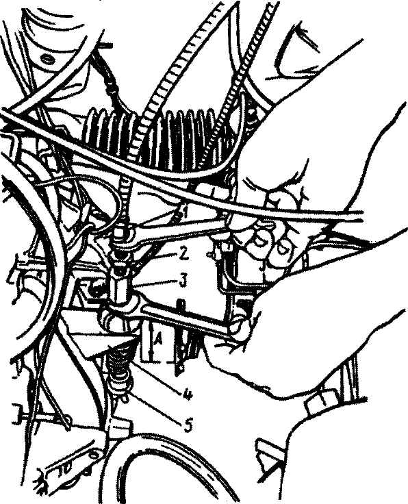 Рис. 3-30. Регулировка рабочего хода рычага выключения сцепления: 1 - регулировочный наконечник оболочки троса; 2 - контргайка; 3 - резьбовая втулка; 4 - прилив картера сцепления; 5 - наружный рычаг вала выключения сцепления Для проверки следует замерить линейкой или штангенциркулем разность размеров А (рис. 3-30), определяющих расстояние между приливом 4 на картере сцепления и торцом головки наружного рычага 5 вала выключения сцепления, при отпущенной и нажатой до упора в коврик пола педали сцепления. Если полученная разность не соответствует требуемому рабочему ходу рычага, равному 15-17 мм, его следует установить регулировкой соединения наконечника 1 оболочки троса и резьбовой втулки 3. Регулировку необходимо производить в следующем порядке: - отпустить контргайку 2 резьбового соединения наконечника 1 оболочки и втулки 3; - удерживая гаечным ключом наконечник 1, вращением резьбовой втулки 3 добейтесь требуемого рабочего хода рычага 5. Для увеличения хода рычага надо свинтить резьбовую втулку 3 с наконечника 1, увеличив длину оболочки, при этом педаль сцепления поднимется и соответственно увеличится ход рычага 5. Для уменьшения хода рычага 5 следует навернуть резьбовую втулку 3 на наконечник 1, уменьшив длину оболочки троса. Один оборот резьбовой втулки соответствует примерно 1,5 мм изменения хода рычага вала выключения сцепления. |