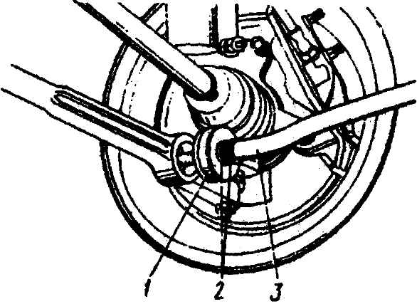 Рис. 4-4. Регулировка продольного наклона оси поворота колеса: 1 - чашка; 2 - регулировочные шайбы; 3 - штанга стабилизатора