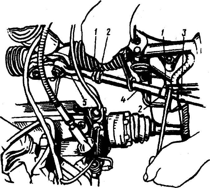 Рис. 4-6. Регулировка схождения передних колес: 1 - контргайки; 2 - муфта рулевой тяги; 3 - наружный наконечник рулевой тяги; 4 - регулировочная тяга; 5 - внутренний наконечник рулевой тяги |