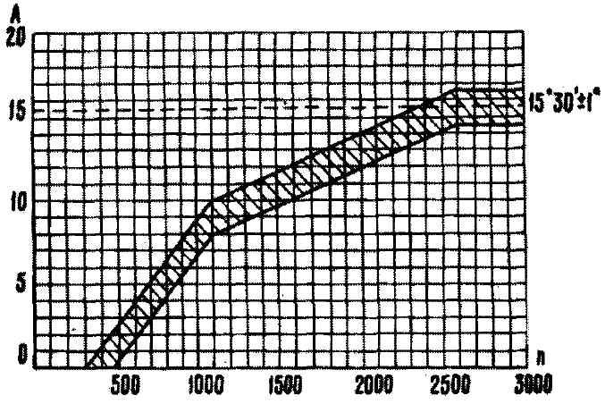Распределитель зажигания 30.3706Перед установкой распределителя зажигания на стенд проверить состояние контактов прерывателя, не заедает ли на оси рычажок с подвижным контактом и усилие прижатия контактов, которое должно быть 5-6 Н (500-600 гс). Проверить износ подушечки рычажка прерывателя; в случае износа установить требуемый зазор между контактами прерывателя. Если рычажок заедает на оси или ослабла его пружина, заменить контактную группу. Если контакты прерывателя загрязнены, пригорели или подверглись эрозии, то зачистить их бархатным надфилем. Предупреждение. Применять для этой цели шлифовальную шкурку и другие абразивные материалы нельзя. После зачистки протереть контакты прерывателя замшей, смоченной в бензине. Затем оттянуть рычажок, чтобы испарился бензин, и протереть контакты еще раз сухой замшей. Вместо замши можно применять любой материал, не оставляющий волокон. Контакты должны соприкасаться всей поверхностью. Если этого не происходит, то, подгибая кронштейн стойки, отрегулировать положение неподвижного контакта. Нельзя подгибать рычажок с подвижным контактом. Протереть крышку распределителя от грязи и масла. Слегка приподняв крышку распределителя, проверить, находится ли наружный контакт ротора против электрода крышки в момент размыкания контактов прерывателя. Для проверки работы распределителя его необходимо установить на стенд для проверки электрических приборов и соединить распределитель с электродвигателем, частота вращения которого регулируется, с катушкой зажигания и с аккумуляторной батареей; четыре клеммы крышки соединить на стенде с искровыми разрядниками, зазор между электродами которых регулируется. Установить зазор 5 мм между электродами разрядников, включить электродвигатель стенда и вращать валик распределителя несколько минут по часовой стрелке с частотой 2000 мин-1. Затем увеличить зазор между электродами до 10 мм и проследить, нет ли внутренних разрядов в распределителе. Внутренние разряды выявляются по звуку или по ослаблению и перебою искрения на разряднике испытательного стенда. Во время работы распределитель не должен производить шума при любой частоте вращения валика. Проверка характеристик распределителя зажигания Проверка характеристики центробежного регулятора распределителя. Установить распределитель на стенд в соответствии с инструкцией стенда. Включить электродвигатель стенда и вращать валик распределителя с частотой вращения 150-200 мин-1. По градуированному диску отсчитать значение в градусах, в соответствии с которым получается одно из четырех искрений. Повышая частоту вращения и производя отсчеты при каждом ее повышении на 200-300 мин-1, определить число градусов опережения зажигания относительно первоначального значения в зависимости от частоты вращения вала распределителя. Полученную характеристику сопоставить с характеристикой, показанной на рис. 7-20.
