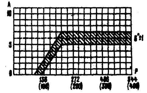 Рис. 7-20. Характеристика центробежного регулятора распределителя зажигания: А - угол опережения зажигания, град; h - частота вращения валика распределителя зажигания, мин-1 Проверка угла замкнутого состояния контактов (УЗСК). Установить распределитель на стенд, снять с него крышку и подсоединить распределитель к стенду в соответствии с инструкцией стенда. Включить электродвигатель стенда и довести частоту вращения валика распределителя до вступления в работу центробежного регулятора опережения зажигания. По освещенным участкам шкалы замерить величину угла замкнутого состояния контактов, которая должна быть 55+3°. После проверки угла замыкания контактов проверить углы между моментами размыкания контактов в первом и других цилиндрах, которые должны быть 90+1° и 180+1°. Проверка сопротивления изоляции. Сопротивление изоляции между различными клеммами и "массой" при температуре 25+5°C должно быть проверено мегомметром. Сопротивление между низковольтной клеммой прерывателя и "массой" измерить при разомкнутых контактах прерывателя. Проверка конденсатора. Емкость конденсатора, замеряемая в диапазоне частоты между 50 и 1000 Гц, должна находиться в пределах 0,20-0,5 мкФ. Сопротивление изоляции при 25+5°C должно быть более 10 МОм. Проверка характеристики вакуумного регулятора распределителя. Установить распределитель на стенд и подсоединить к стенду в соответствии с инструкцией стенда. Включить электродвигатель стенда и вращать валик распределителя с частотой 1000 мин-1. По градуированному диску отсчитывать значения в градусах, при которых получается одно из четырех искрений. Плавно увеличивая разрежение, через каждые 27,2 гПа (20 мм рт. ст.) отмечать число градусов опережения зажигания относительно первоначального значения. Полученную характеристику сравнить с характеристикой на рис. 7-21.