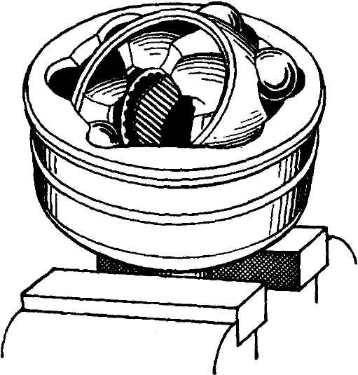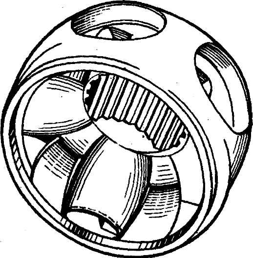 Рис. 3-133. Извлечение обоймы из сепаратора наружного шарнира - тщательно промыть детали шарнира и проверить их состояние, обращая особое внимание на шлифованные поверхности дорожек и сферические поверхности сепаратора и шариков. Наличие трещин, сколов и следов коррозии недопустимо. При износе рабочих поверхностей беговых дорожек более чем на 0,1 мм и наличии указанных выше дефектов заменить шарнир в сборе. Сборка наружного шарнира производится в порядке, обратном разборке, с учетом следующего: - при необходимости заменить запорное кольцо шарнира; - перед сборкой смазать все детали шарнира смазкой ШРУС-4; - при установке сепаратора в сборе с обоймой обеспечить совпадение меток, нанесенных перед разборкой; - при установке шариков в сепаратор наклонить обойму на угол, приблизительно в два раза больший, чем угол наклона сепаратора; - заложить в шарнир смазку ШРУС-4 в количестве 50 г через шлицевое отверстие обоймы и 25 г на торцевую поверхность шарнира; - перед установкой хомутов выпустить избыток воздуха из чехла, оттянув отверткой внутренний посадочный поясок чехла; - затянуть хомуты и проверить, нет ли трещин в зоне замка хомутов. При обнаружении трещин заменить хомуты новыми. Хомуты должны надежно фиксировать грязезащитные чехлы на посадочных поясках и обеспечить шарнирам полную герметичность. |