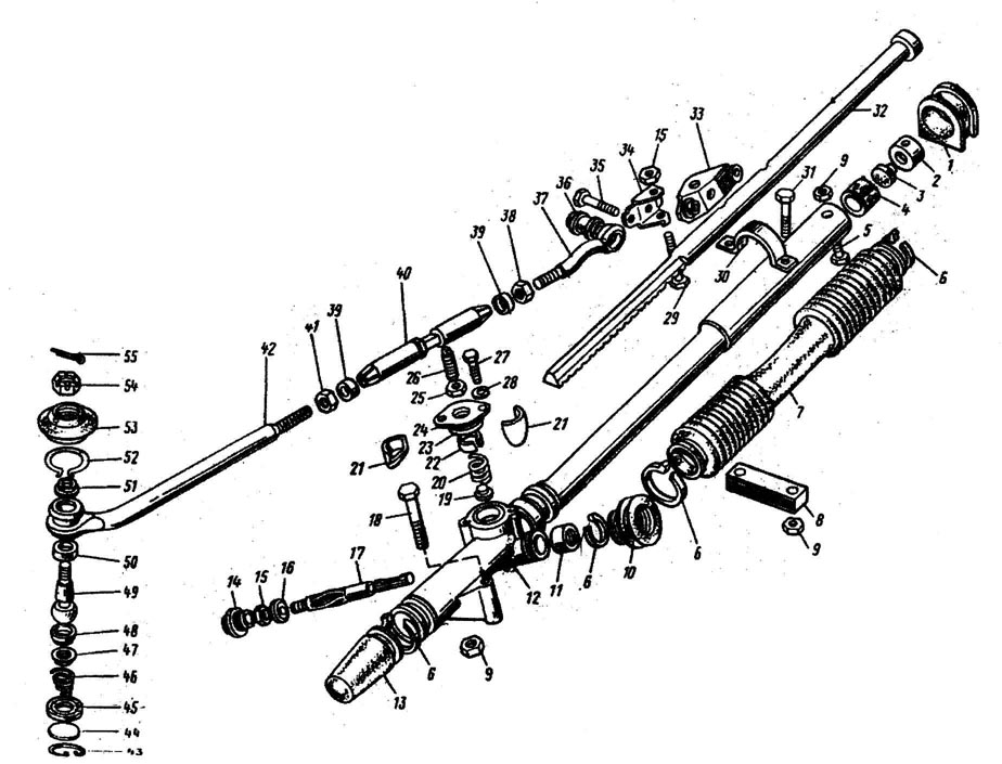Рис. 5-4. Детали рулевого механизма: 1 - опорное кольцо; 2 - заглушка картера; 3 - резиновый буфер заглушки; 4 - опорная втулка рейки; 5, 18, 31 - болты; 6 - хомут; 7 - гофрированный грязезащитный чехол; 8 - опора рулевого механизма; 9, 38, 54 - гайки; 10 - уплотнительный чехол; 11 - роликовый подшипник шестерни; 12 - картер рулевого механизма; 13 - торцевой грязезащитный чехол; 14 - гайка; 15 - самостопорящаяся гайка; 16 - шариковый подшипник шестерни; 17 - шестерня; 19 - опорная шайба; 20 - пружина опор рейки; 21 - опора рейки; 22 - распорное кольцо опор рейки; 23 - уплотнительное кольцо; 24 - крышка картера; 25 - контргайка; 26 - регулировочный винт; 27 - болт крышки картера; 28 - пружинная шайба; 29 - болт скобы; 30 - кронштейн опоры; 32 - рейка; 33 - скоба крепления тяг; 34 - стопорная пластина скобы крепления тяг; 35 - болт крепления внутренних наконечников тяг; 36 - резинометаллический цилиндр; 37 - внутренний наконечник рулевой тяги; 39 - муфта рулевой тяги; 40 - регулировочная тяга; 41 - гайка; 42 - наружный наконечник рулевой тяги; 43 - стопорное кольцо; 44 - заглушка, 45 - уплотнительное кольцо; 46 - пружина; 47 - нажимной вкладыш; 48 - нижний опорный вкладыш; 49 - шаровой палец; 50 - верхний опорный вкладыш; 51 - опорная шайба; 52 - шплинт-проволока; 53 - грязезащитный чехол; 55 - шплинт - отвернуть болт 5 крепления заглушки 2 картера и снять резиновое опорное кольцо 1 крепления рулевого механизма; - снять хомуты 6 и крепящиеся ими чехлы 7 и 13; - отвернуть болты 27 крепления крышки картера и вынуть пружину 20 с опорной шайбой 19. При помощи приспособления 80-П094 извлечь распорное кольцо 22 и опоры рейки 21; - выпрессовать из трубы картера заглушку 2 и вынуть рейку 32 из картера в сторону заглушки; - расконтрив гайку 14 шестерни, отвернуть ее и легким постукиванием пластмассового молотка по торцу шестерни 17 вынуть ее из картера в сборе с шариковым подшипником 16; - отвернуть гайку 15 крепления подшипника, зажав шестерню в тисках с мягкими губками, и спрессовать шариковый подшипник с шестерни; - съемником 80-П088 выпрессовать опорную втулку 4 из трубы картера; - выпрессовать роликовый подшипник из картера. Перед проверкой деталей промыть полости картера рулевого механизма и все металлические детали в керосине. Резиновые детали промыть теплой водой и протереть чистой тряпкой. Осмотреть, нет ли на рабочих поверхностях шестерни 17, рейки 32 и опорной втулки 4 следов износа, задиров или рисок. Незначительные повреждения устранить мелкозернистой шлифовальной шкуркой или бархатным напильником. Изношенные и поврежденные детали заменить. Шариковый подшипник 16 должен вращаться свободно, без заеданий, на поверхности колец и шариков не должно быть следов износа. Ролики, обоймы, сальниковое уплотнение роликового подшипника 11 не должны иметь износа и повреждений. При малейшем сомнении подшипники следует заменить на новые. Проверить состояние чехла 7 и торцевого чехла 13. Если они имеют трещины, разрывы и неплотную посадку на деталях, заменить их новыми. Сборку рулевого механизма необходимо производить в следующем порядке: - запрессовать опорную втулку 4 в трубу картера резиновой окантовкой наружу; - запрессовать роликовый подшипник 11 таким образом, чтобы торец подшипника со стороны уплотнения был заподлицо с торцом картера; - напрессовать шариковый подшипник 16 на шестерню 17 и затянуть его гайкой 15; момент затяжки 40-50 Н·м (4-5 кгс·м); - установить шестерню с подшип
