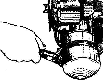 Рис. 2-1. Снятие масляного фильтра приспособлением А.60312 Работы, производимые с правой стороны Снять перепускной шланг системы вентиляции картера со штуцера, расположенного на карбюраторе. Ослабить хомут крепления рукава подвода теплого воздуха на патрубке воздухозаборника и снять рукав с патрубка. Освободить рукав подвода холодного воздуха из зажима крепления. Отвернуть четыре гайки, снять подводящий фланец и прокладку со шпилек карбюратора и установить на карбюратор технологическую заглушку. Отсоединить и снять ремни крепления воздушного фильтра. Снять воздушный фильтр (рис. 2-2) в сборе с терморегулятором, воздухозаборными рукавами, подводящим фланцем к карбюратору и со шлангами системы вентиляции картера. Отсоединить отводящий и подводящий шланги радиатора отопителя и шланг вакуумного усилителя тормозов. Отсоединить от патрубка термостата шланг, идущий от радиатора. Отвернуть четыре гайки крепления приемной трубы глушителя и снять со шпилек выпускного коллектора фланец приемной трубы и прокладку (рис. 2-3). Снять теплозащитный щиток стартера. Отсоединить провода от стартера, генератора и карбюратора. Отсоединить от двигателя "массовый" провод. Отсоединить от карбюратора тросы привода дроссельной и воздушной заслонок (рис. 2-4). Снять со штуцеров карбюратора и впускной трубы трубки системы ЭПХХ карбюратора. Отвернуть три болта и снять стартер. Снять коробку передач в сборе с картером сцепления (см. раздел "Коробка передач"). Закрепить двигатель с правой стороны за рым, установленный на передней шпильке крепления выпускного коллектора, а с левой стороны - за специальную проушину, расположенную на картере сцепления. Слегка натянуть трос тали и отвернуть гайки крепления переходников подушек передних опор двигателя к поперечине передней подвески. Вынуть двигатель из моторного отсека.